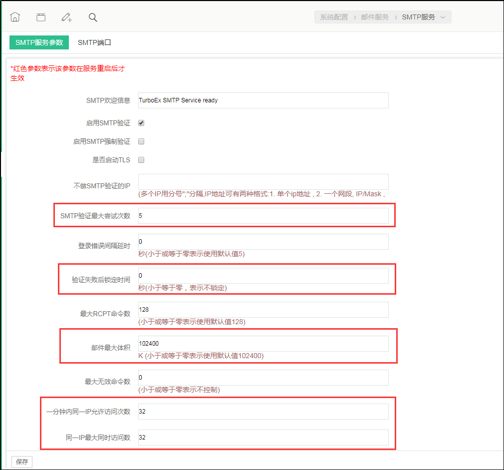 - 设置后SMTP验证账号信息超过尝试次数后会锁定账号,设置“邮件最大体积”