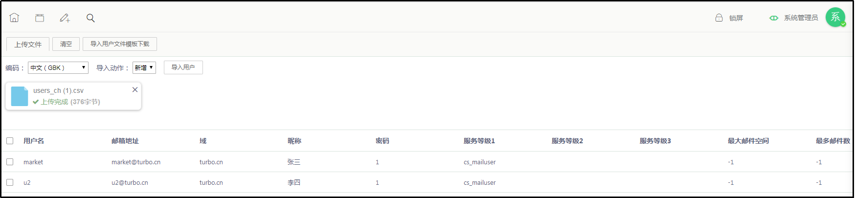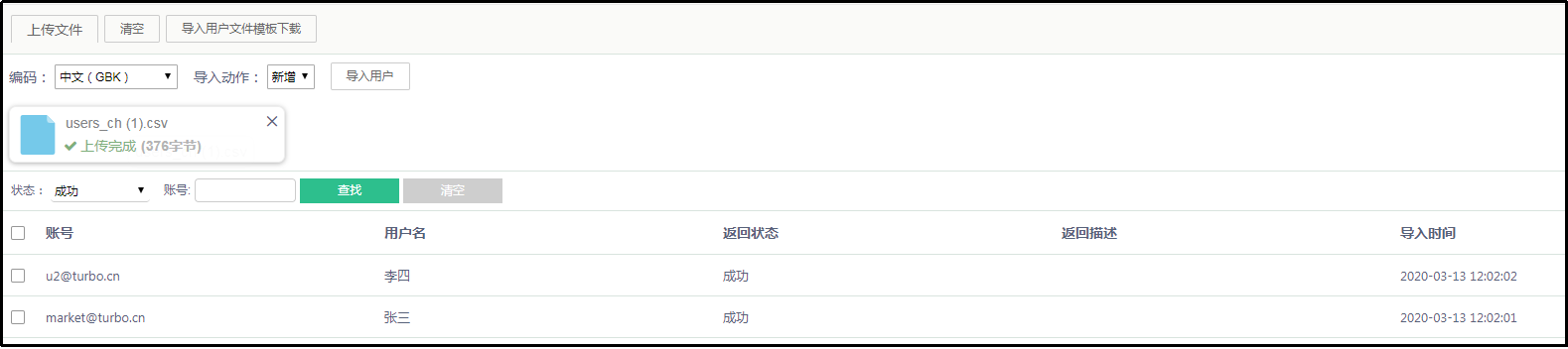 - 查看上传结果无误后,点击“导入用户”,提示导入成功