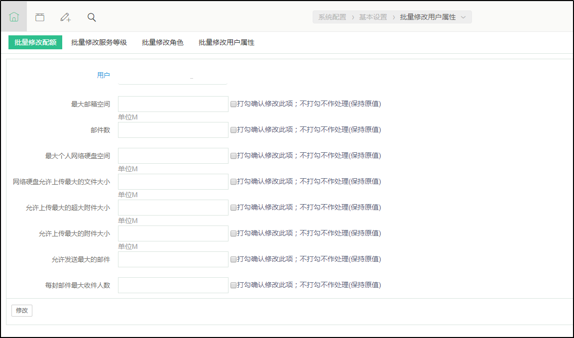 - 进入“系统配置”》“基本设置”》“批量修改用户属性”