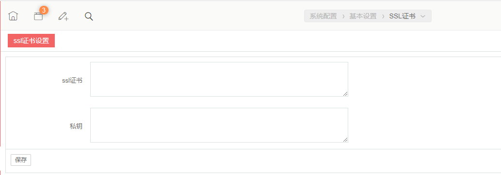 - 配置证书,进入系统配置-》基本设置-》ssl证书