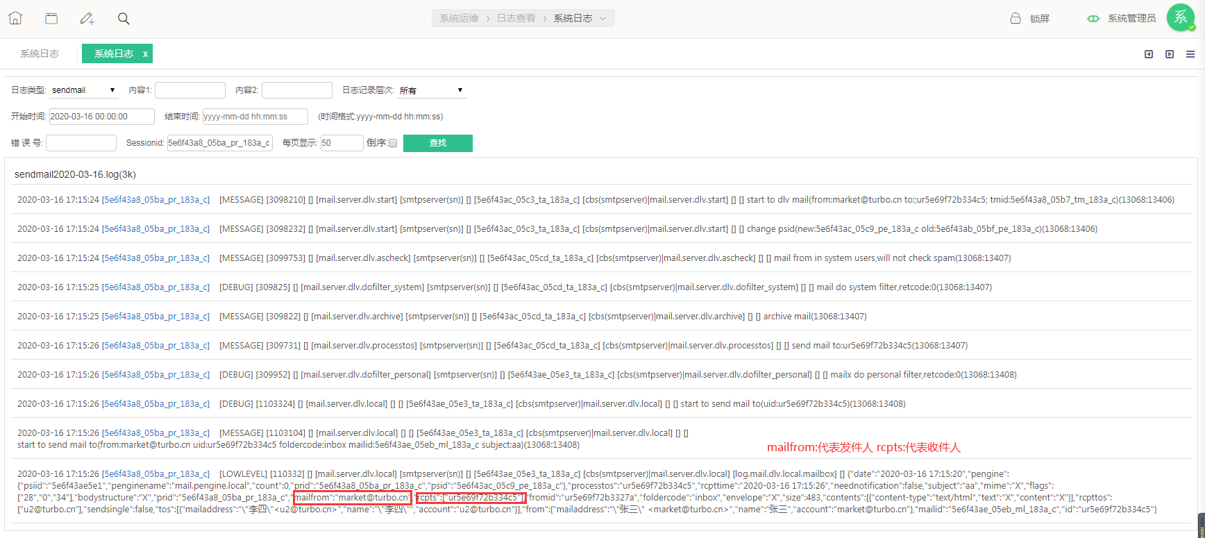 - 任何一封邮件,不管是系统往外发的还是外部发送进来的,TurboEx邮件系统都会有完整的日志记录。下面具体介绍下如何查询日志。