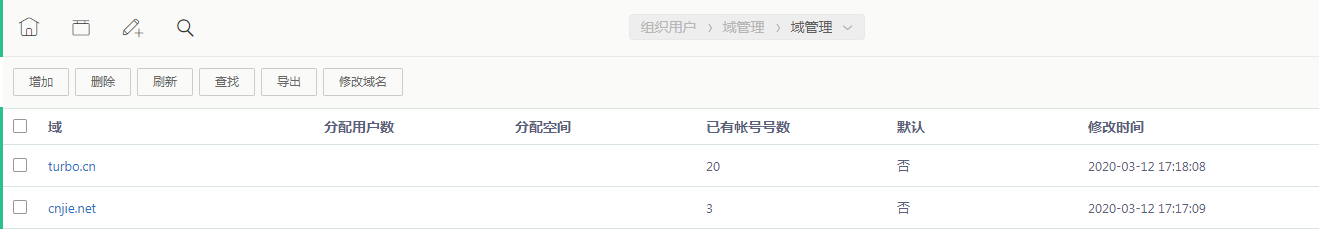 - 进入“组织用户”》“域管理”,添加域名,点击“增加”添加域名