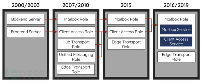 Exchange Server 2010 包含五个服务器角色,而在 Exchange Server 2013 精简到了三个服务器角色,在 Exchange Server 2016 和 Exchange Server 2019 中只有两个服务器角色: