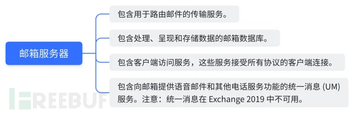 托管邮箱、公共文件夹等数据,主要包含集线传输服务(Hub Transport Service)和邮箱传输服务(Mail Transport Service)两大组件服务。